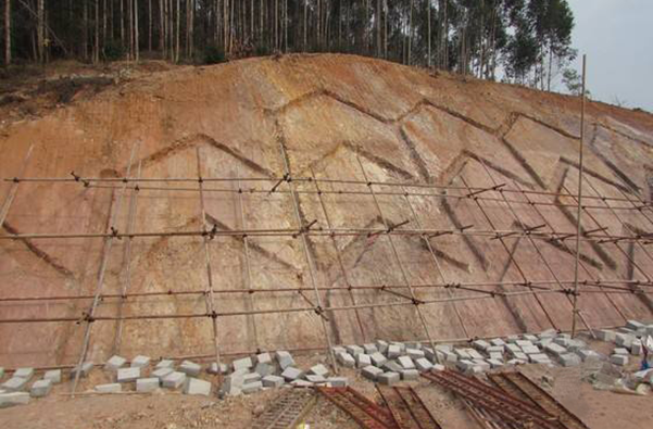 打錨桿掛網(wǎng)可按施工圖紙施工,鋪網(wǎng)盡量貼近坡面、對部分高凸低洼坡面多打幾個U形釘使網(wǎng)貼近坡面。鋪網(wǎng)的平整度直接影響后期噴播的效果,網(wǎng)面的的越好一次成型覆蓋率越高、重復噴播次數(shù)越少,成本也會降低。