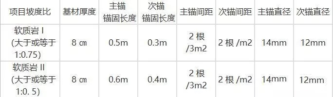 (2)主錨和次錨:根據(jù)巖面強度和坡比不同確定主、次錨的直徑、錨固長度及每平方米錨桿根數(shù)(詳見下表2)