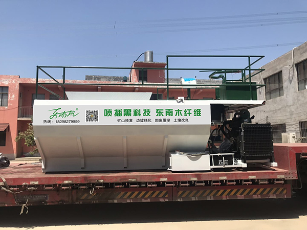 濕法客土噴播使用的設(shè)備是泥漿泵噴射機(jī),這種設(shè)備的基本構(gòu)造與液壓噴播機(jī)基本一致, 都是由柴油機(jī)動力系統(tǒng)、攪拌系統(tǒng)、泵送系統(tǒng)和噴射系統(tǒng)構(gòu)成。將客土材料和水裝進(jìn)儲料灌中, 經(jīng)過機(jī)械+回流攪拌, 形成固形物重量含量超過 50%的混合漿液( 最大濃度 60%) , 再通過泵送系統(tǒng)將高濃度泥漿噴射到作業(yè)面上。濕法客土噴播所形成的客土厚度較干法客土噴播要薄, 一般為 3~5cm; 噴射距離較近,一般在 30~50m 左右。