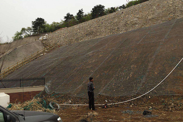 綠化噴漿網(wǎng)是以團粒劑使客土形成團?;Y(jié)構(gòu),加筋纖維在其中起到類似植物根莖的網(wǎng)絡(luò)加筋作用,從而造就有一定厚度的具有耐雨水、風(fēng)侵蝕,牢固透氣,與自然表土相類似或更優(yōu)的多孔穩(wěn)定土壤結(jié)構(gòu)。