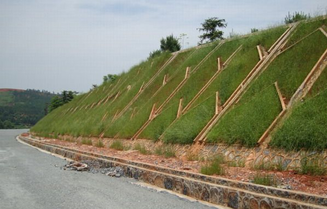 (7)客土噴播使用的輔助材料:如果該方法用于惡劣環(huán)境的巖石邊坡,如礫石層、軟巖、破碎層及較硬的基巖石等區(qū)域,應(yīng)該使用鍍鋅鐵絲網(wǎng)固定,并用錨 桿打進巖石中,用于掛鍍鋅鐵絲網(wǎng)并起到一定的穩(wěn)固邊坡的作用。